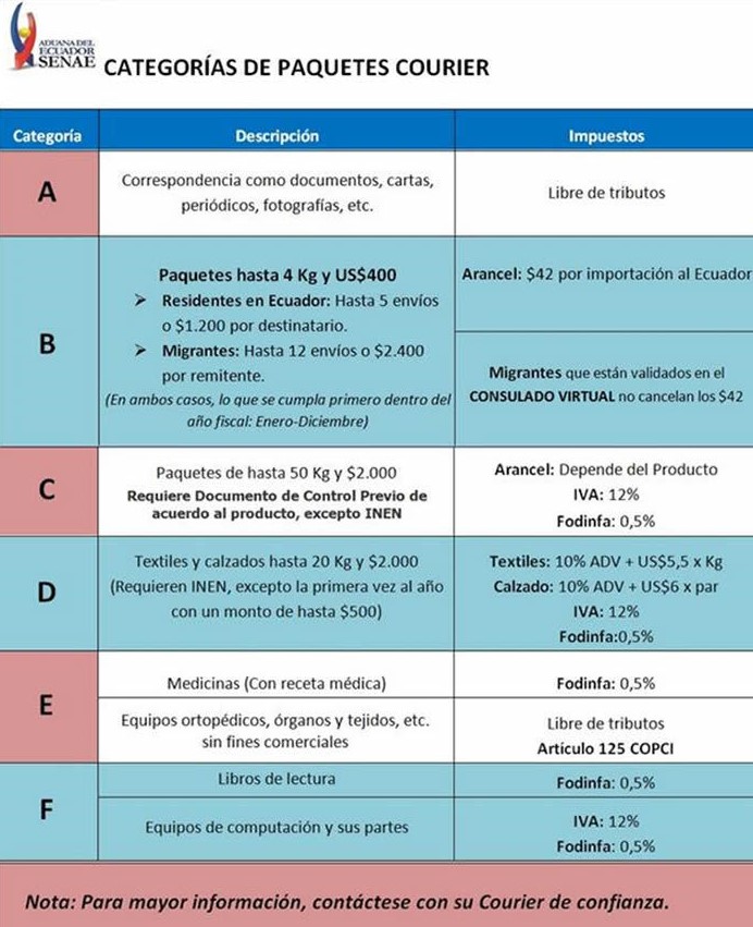 Aduana del Ecuador: Categorías de Paquetes