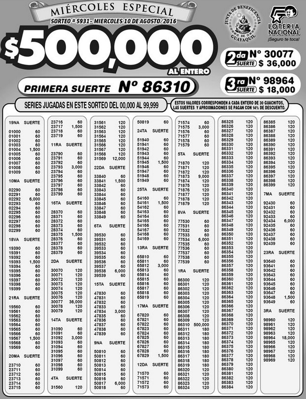 Resultados Lotería Nacional Sorteo 5931 (10-08-2016) ← Previous Next → Resultados Lotería Nacional Sorteo 5931 (10/08/2016)