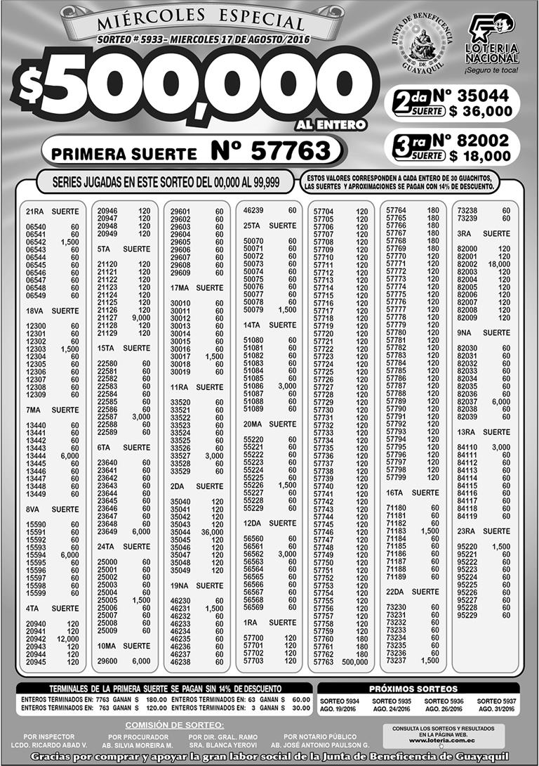Resultados Lotería Nacional Sorteo 5933 (17082016)
