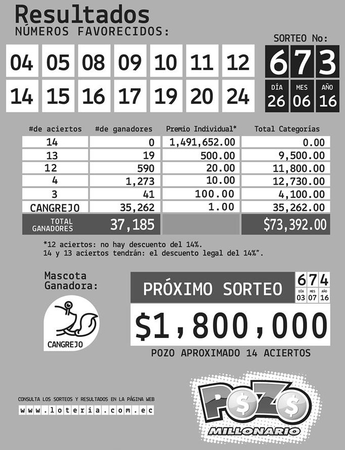 Resultados Pozo Millonario Sorteo 673 (26 JUN 2016) ← Previous Next → Resultados Pozo Millonario Sorteo 673 (26 JUN 2016)